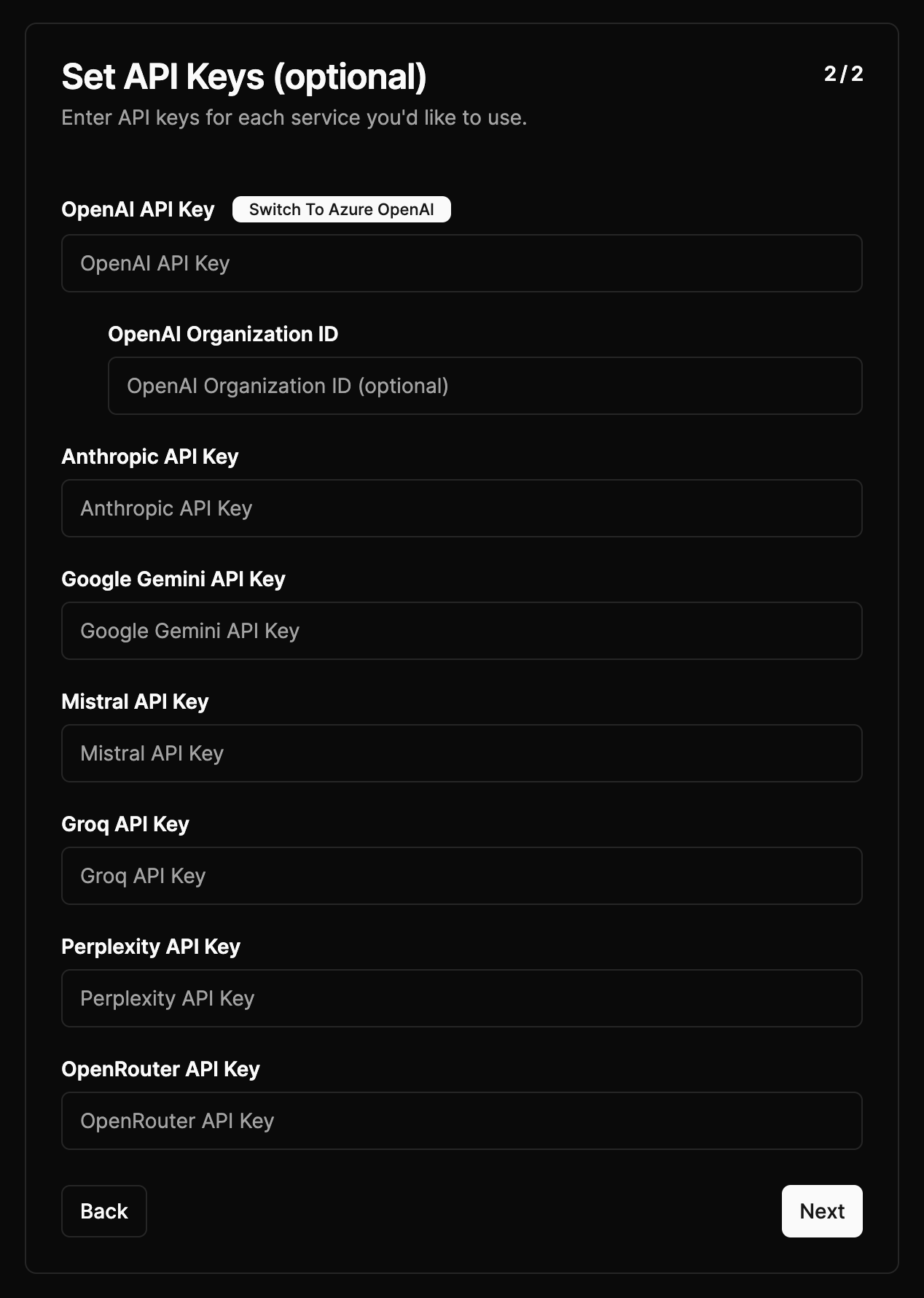 自分が使用する予定のあるAPIキーだけを入力すれば良い。筆者は、OpenAI、Anthropic、GoogleのAPIキーを発行して、GPT-4, Claude 3, Gemini Proを全て利用可能にしている。