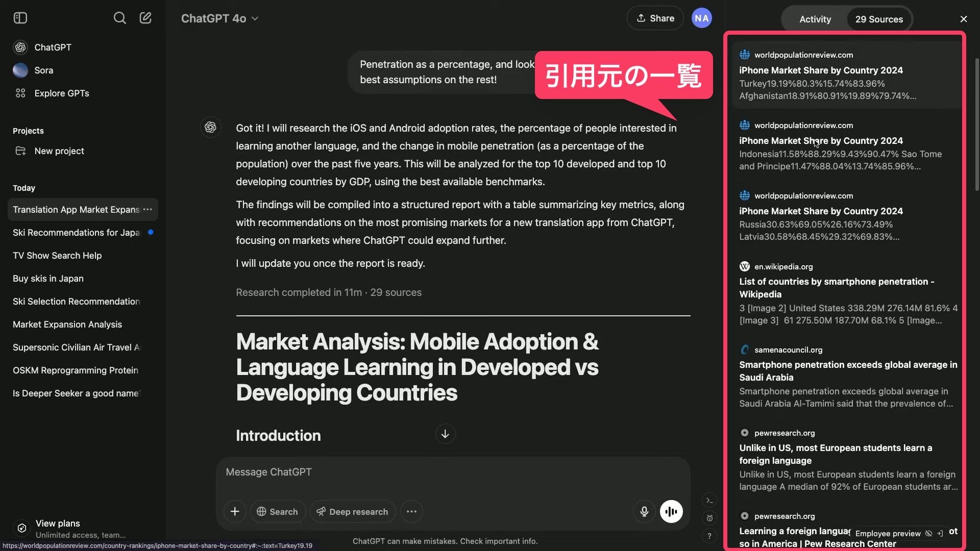 ここでは、人口は割合と実数どちらが必要か、「言語を学びたい」ことをどう定義するか(一般的関心か、既に学習中か)など、レポート作成に必要になりそうなポイントを、ChatGPTが質問してきている。