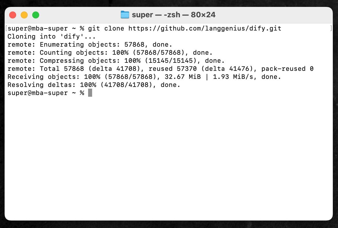 これは、Github上に公開されているDifyのオープンソース版を、丸ごと自分のMacのホームフォルダにダウンロードしてくるコマンドだ。