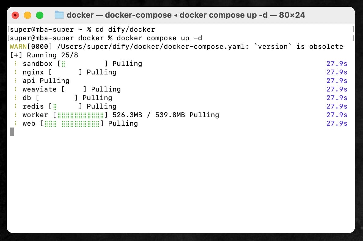 以上のコマンドを打ち込んでアップデートが完了したら、再び、初回起動時に使った以下のコマンドをターミナルに打ち込むことで、またDifyが使えるようになる。