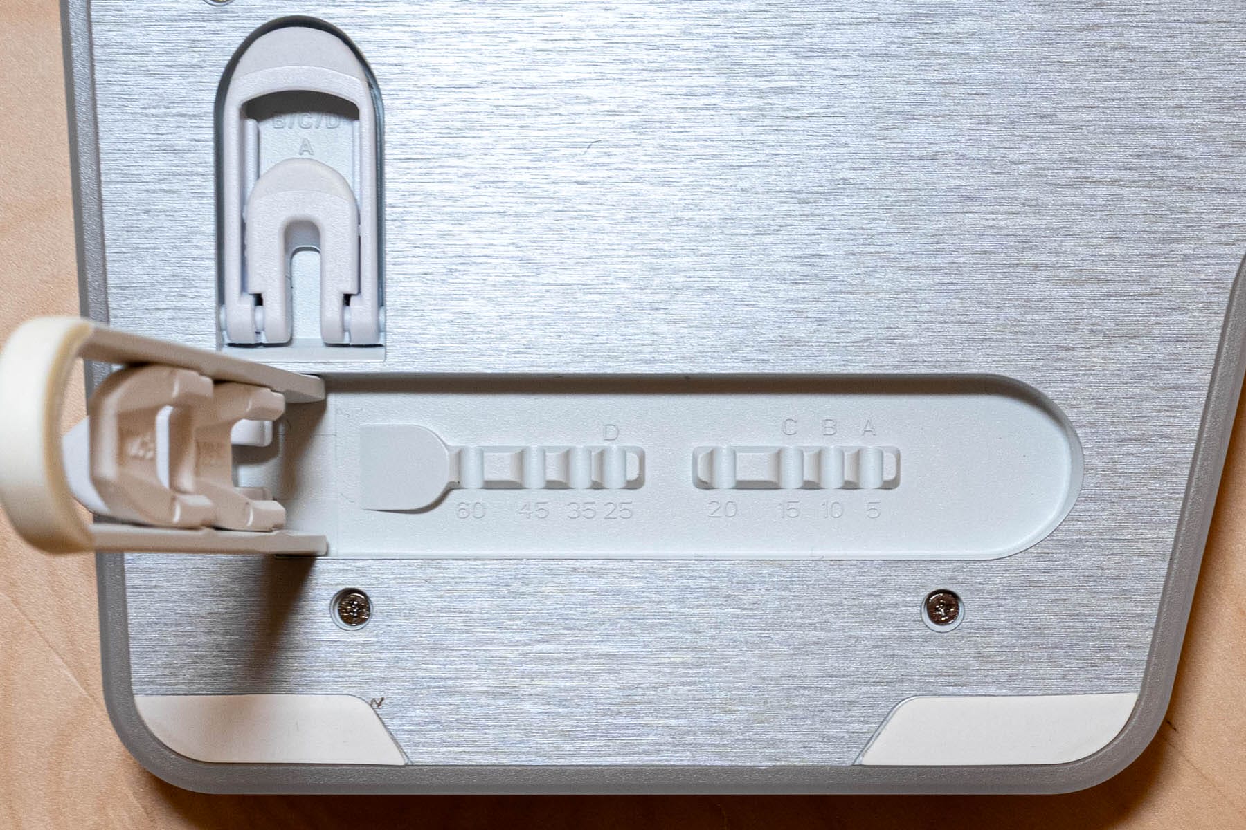 背面の脚部分には、以下の画像のようにアングルが印字されており、5度から60度まで、細かくテンティングの角度を調整可能だ。