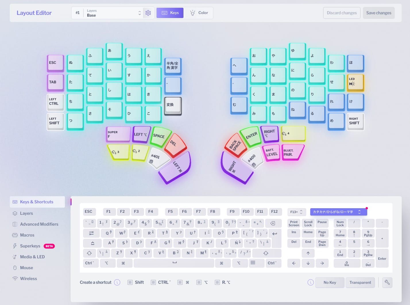 キーマップの変更だけでなく、同じくBazecorのレイアウトエディタ上で、キー1つ1つを色分けすることができる。色分けはレイヤー毎にも変更が可能だ。