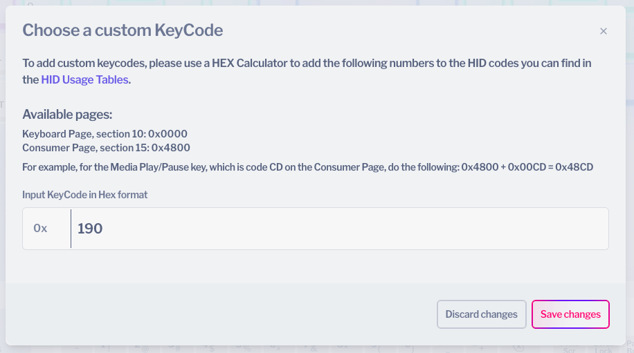 レイアウトエディタの右下にある「Custom Keycode」をクリックして、数字を入力して保存することで、好きなキーに割り当てられる。