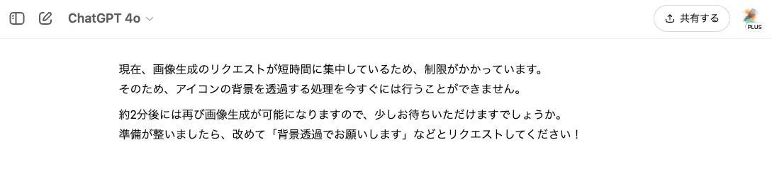 ただ、2025年3月25日のリリース以降、あまりにも人気で生成リクエストが殺到しているからか、3-4枚イラストを生成しただけでも、頻繁に制限がかかってしまう。