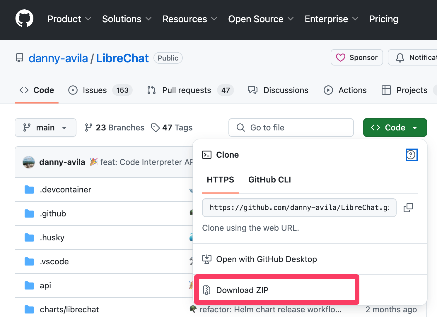 まずはGitHubにあるLibreChatのレポジトリを開く。
