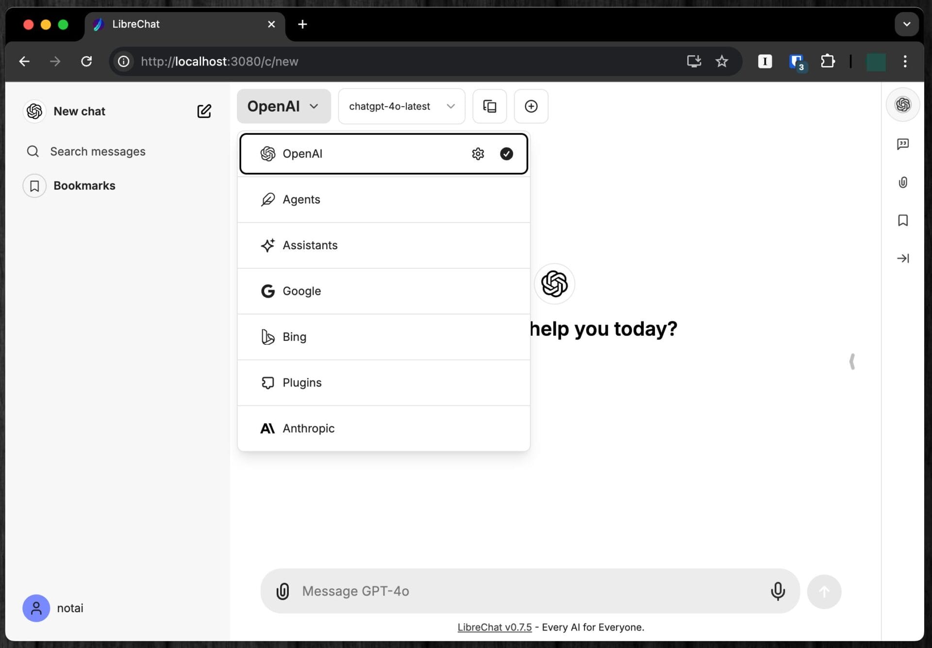 以上で、最新のアップデートが反映され、再びhttp://localhost:3080/にアクセスすることで、LibreChatが利用できる。