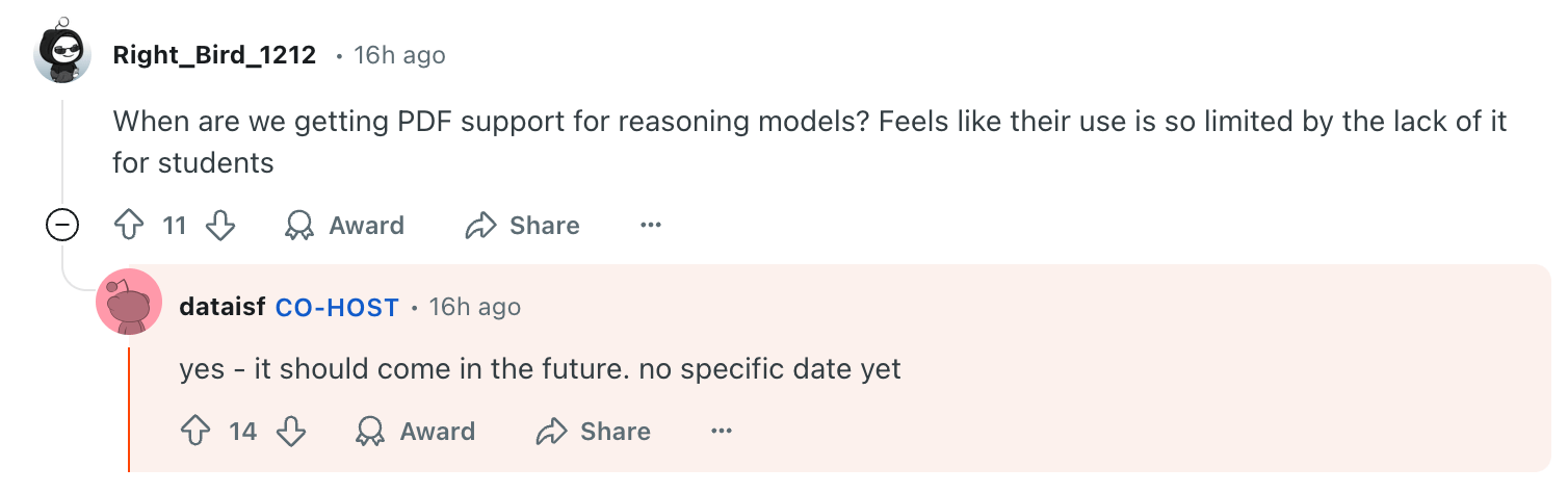 また、o1, o3などの推論モデルに対して、ファイルのアップロード(画像やPDFだけでなくコードファイルなど)を可能とする予定はあるか、と言う問いに対しても、現在準備中と回答されている。