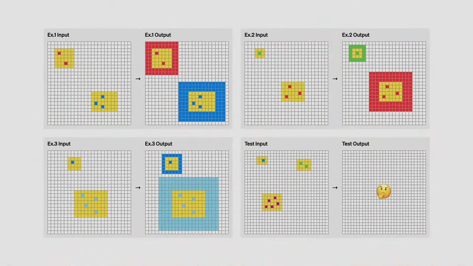 左側で示されたインプットとアウトプットの関係を踏まえて、右側のアウトプットがどうあるべきかを予測する問題。人間であれば、欠けている角に濃い青を塗る、という回答が簡単に出せるが、AIモデルにとっては解くのが非常に難しいのだという。