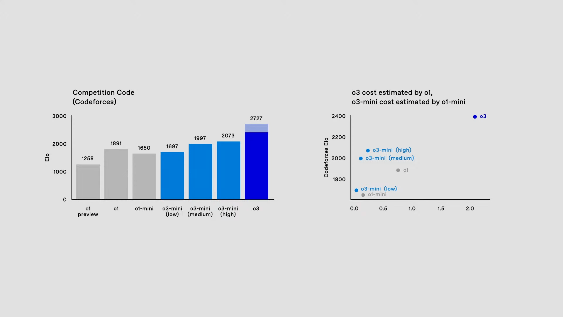 中程度の計算負荷のo3-mini (medium)ですら、o1のスコアである1891を上回っている。