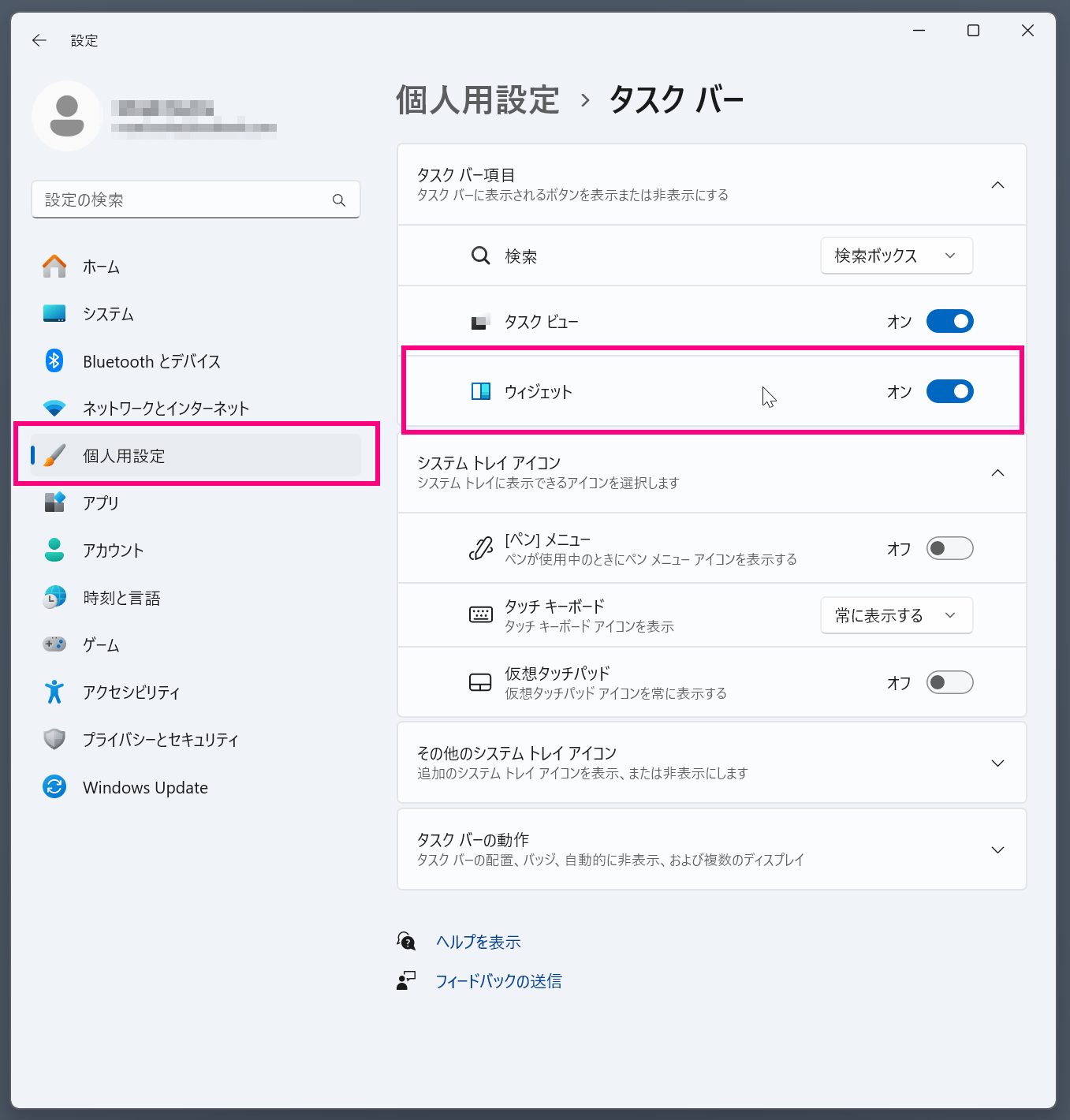 システムアイコンの表示/非表示の設定は、以下の手順で変更できる。