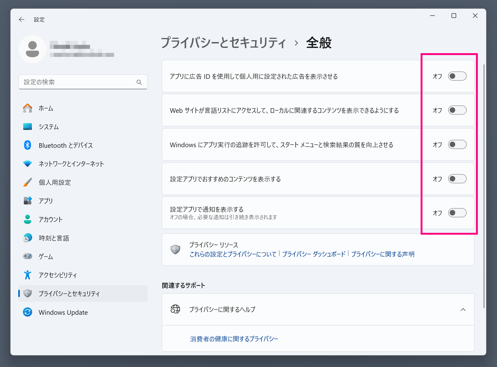 - これをオフにすることで、Windows全体での広告表示が大幅に抑制される