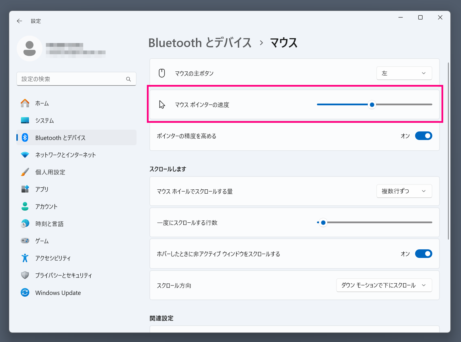 「設定」を開き、「Bluetoothとデバイス」メニューから、「マウス」をクリックすることで調整できる。